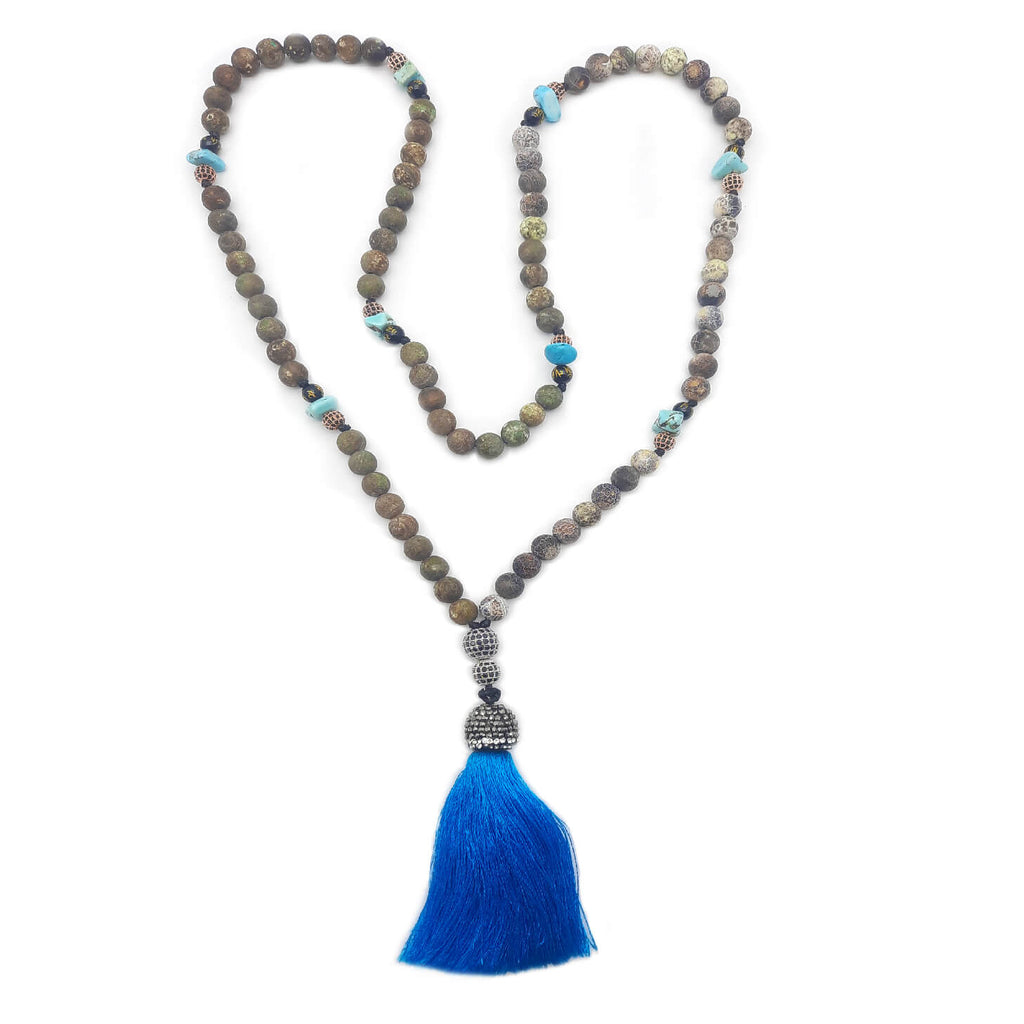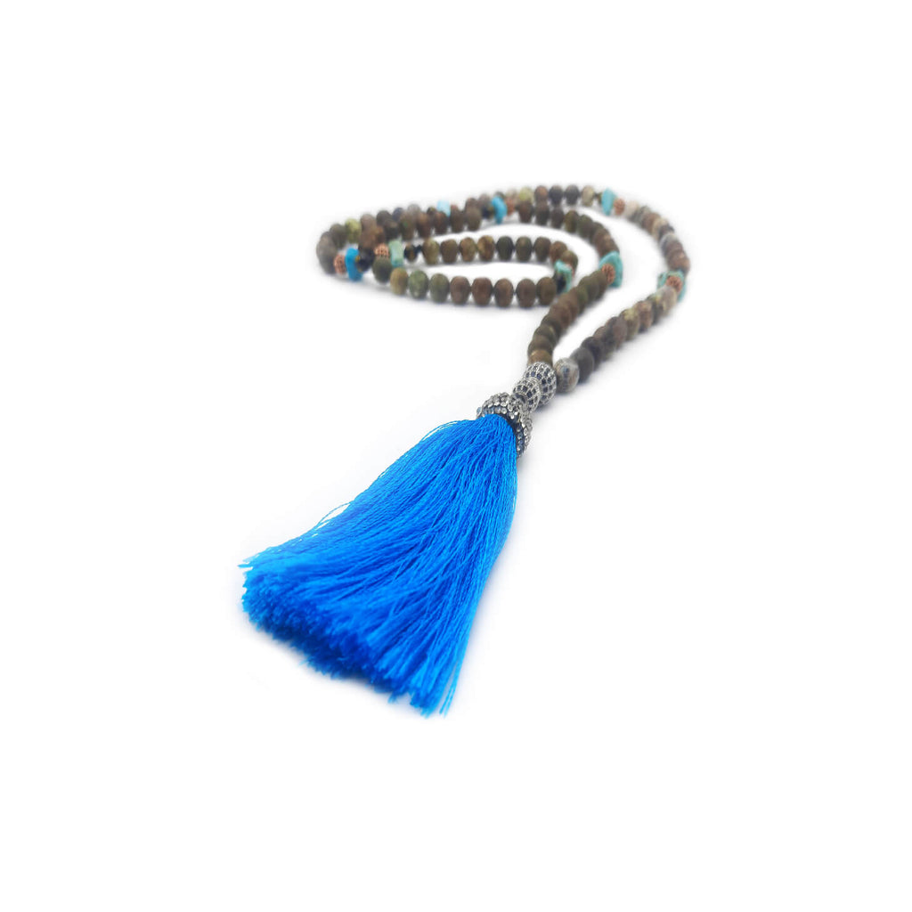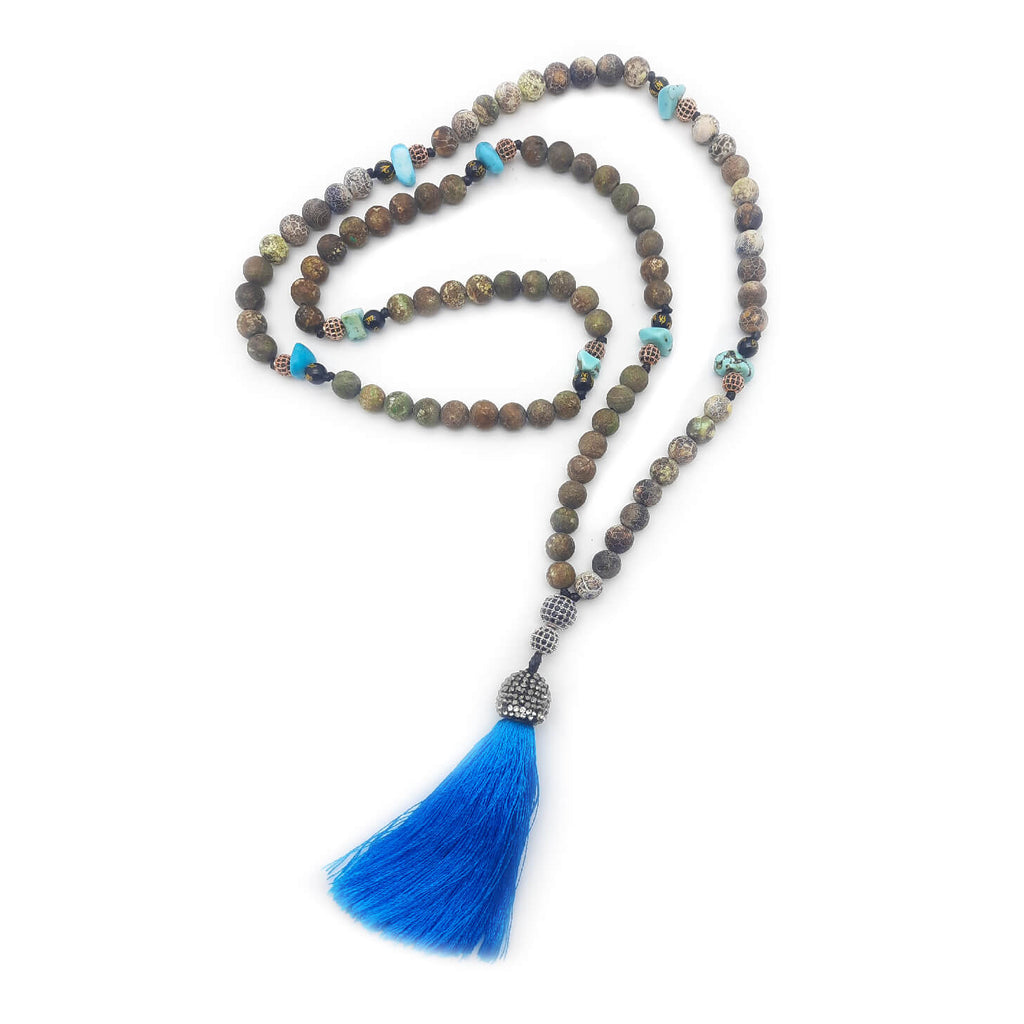 Vi presentiamo la nostra affascinante collezione di Mala tibetani! Realizzato con la massima cura e attenzione ai dettagli, ogni Mala è composto da 108 grani, un numero perfetto che simboleggia la crescita spirituale e l'illuminazione. Queste splendide pietre e cristalli naturali possiedono proprietà curative uniche, che vi daranno il potere di intraprendere il vostro viaggio verso la scoperta di voi stessi. Abbracciate le infinite possibilità che si celano dentro di voi indossando questo squisito accessorio, ornato dalla classica nappina che richiama l'abbigliamento dei monaci tibetani. Liberate il vostro spirito interiore e lasciate che la vostra personalità risplenda con la nostra incantevole collezione di Mala. Elevate il vostro stile e la vostra anima.