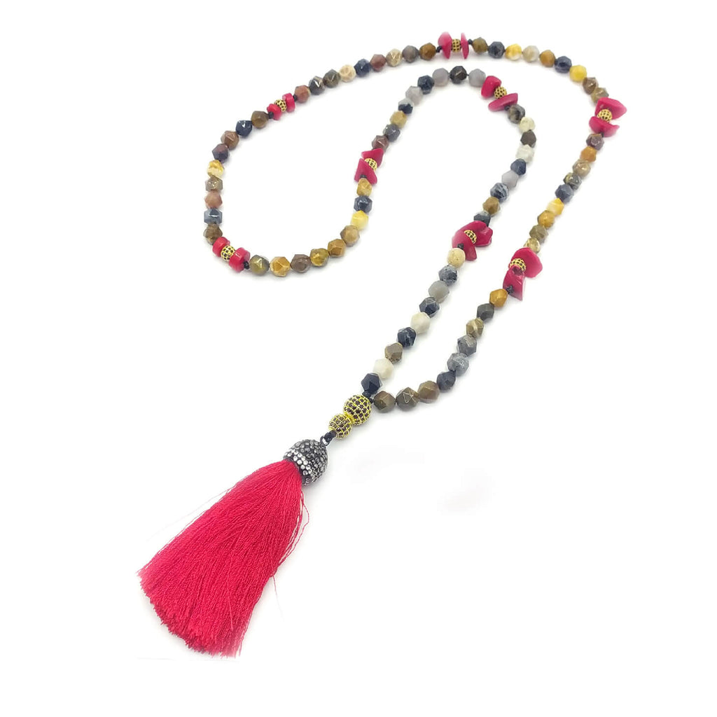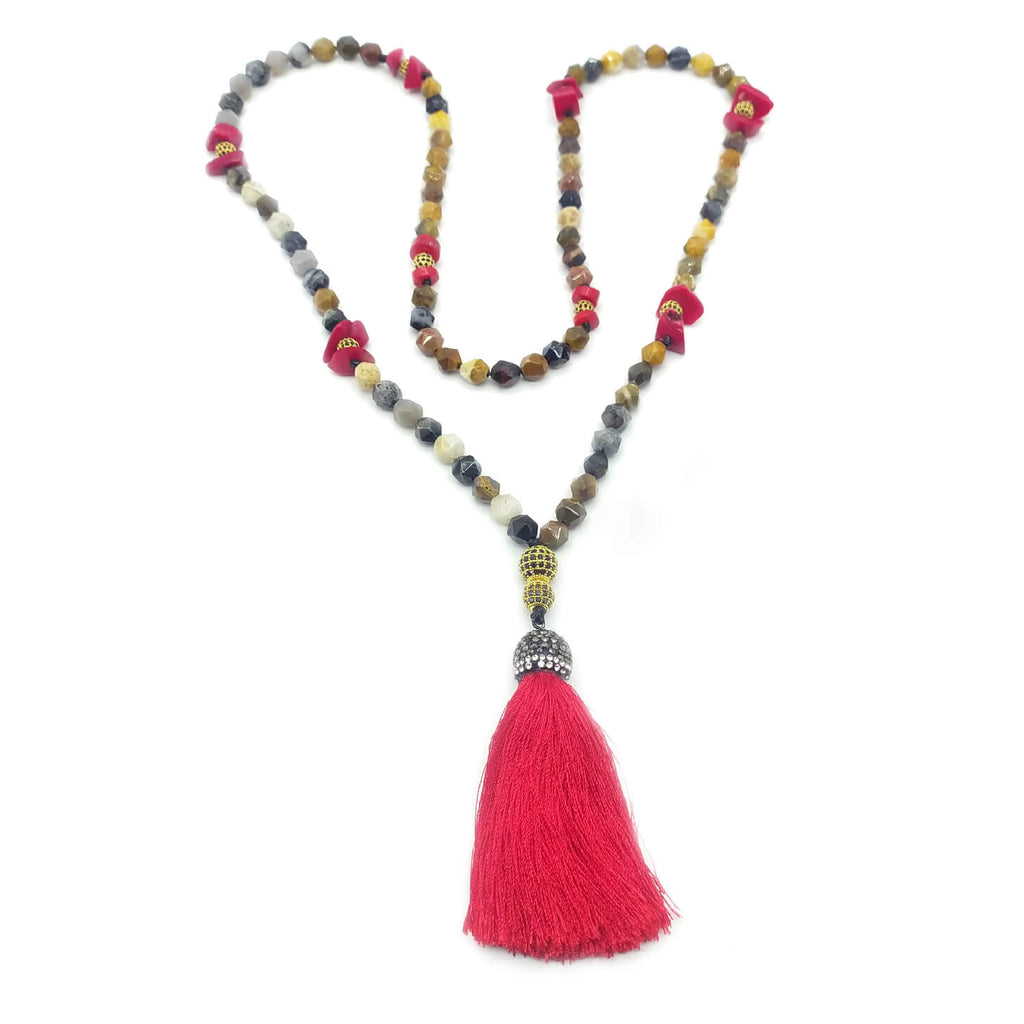 Vi presentiamo la nostra affascinante collezione di Mala tibetani! Realizzato con la massima cura e attenzione ai dettagli, ogni Mala è composto da 108 grani, un numero perfetto che simboleggia la crescita spirituale e l'illuminazione. Queste splendide pietre e cristalli naturali possiedono proprietà curative uniche, che vi daranno il potere di intraprendere il vostro viaggio verso la scoperta di voi stessi. Abbracciate le infinite possibilità che si celano dentro di voi indossando questo squisito accessorio, ornato dalla classica nappina che richiama l'abbigliamento dei monaci tibetani. Liberate il vostro spirito interiore e lasciate che la vostra personalità risplenda con la nostra incantevole collezione di Mala. Elevate il vostro stile e la vostra anima.