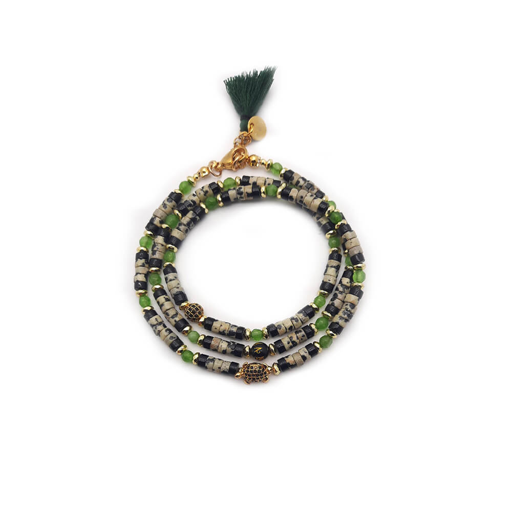I cristalli neri utilizzati in questo bracciale trasmettono forza e potere a chi lo indossa. Tara nera è considerata l'invincibile, dai toni scuri e dall'aspetto moderatamente irato. La divinità regge il vaso nero da cui si liberano le armi che danno il potere di distruggere i sortilegi e le influenze negative. Il nero esotericamente e socialmente indica la volontà di andare contro la massa e di seguire la propria volontà, senza attenersi alle linee guida dettate dalla società.