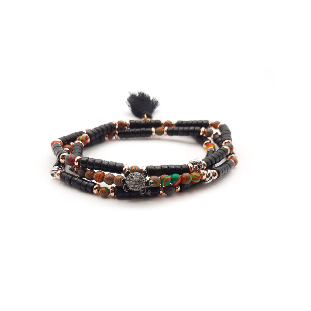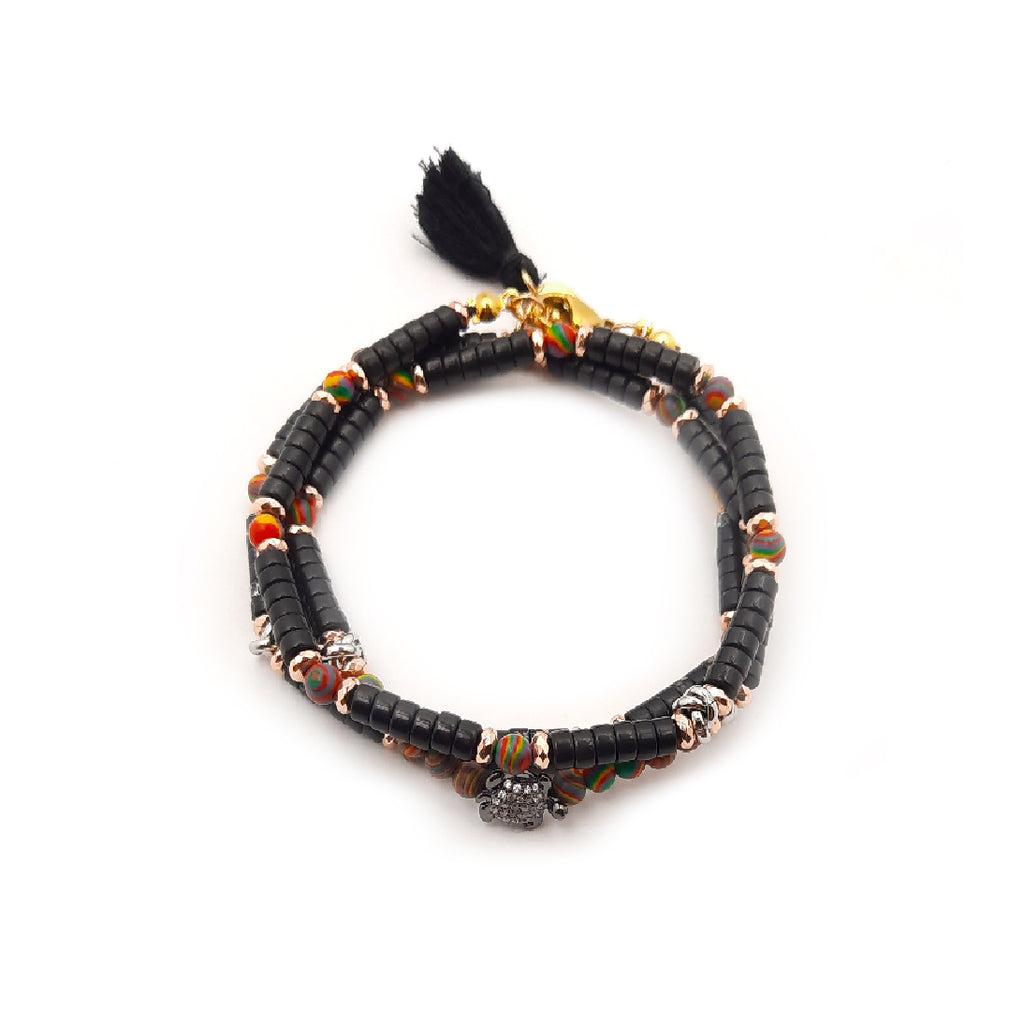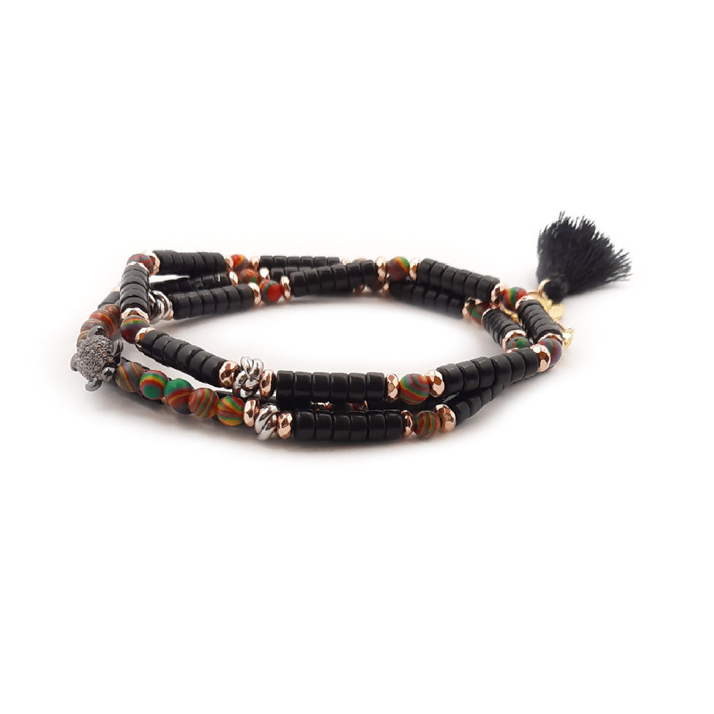 I cristalli neri utilizzati in questo bracciale trasmettono forza e potere a chi lo indossa. Tara nera è considerata l'invincibile, dai toni scuri e dall'aspetto moderatamente irato. La divinità regge il vaso nero da cui si liberano le armi che danno il potere di distruggere i sortilegi e le influenze negative. Il nero esotericamente e socialmente indica la volontà di andare contro la massa e di seguire la propria volontà, senza attenersi alle linee guida dettate dalla società.