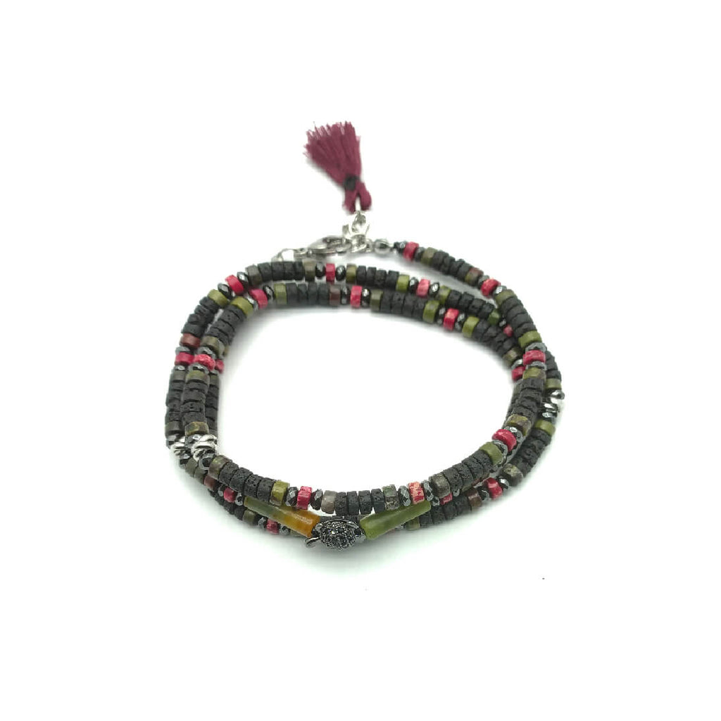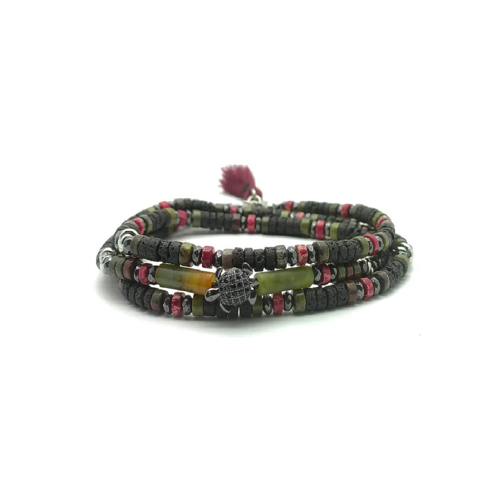 I cristalli neri utilizzati in questo bracciale trasmettono forza e potere a chi lo indossa. Tara nera è considerata l'invincibile, dai toni scuri e dall'aspetto moderatamente irato. La divinità regge il vaso nero da cui si liberano le armi che danno il potere di distruggere i sortilegi e le influenze negative. Il nero esotericamente e socialmente indica la volontà di andare contro la massa e di seguire la propria volontà, senza attenersi alle linee guida dettate dalla società.