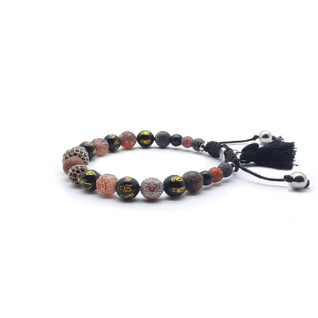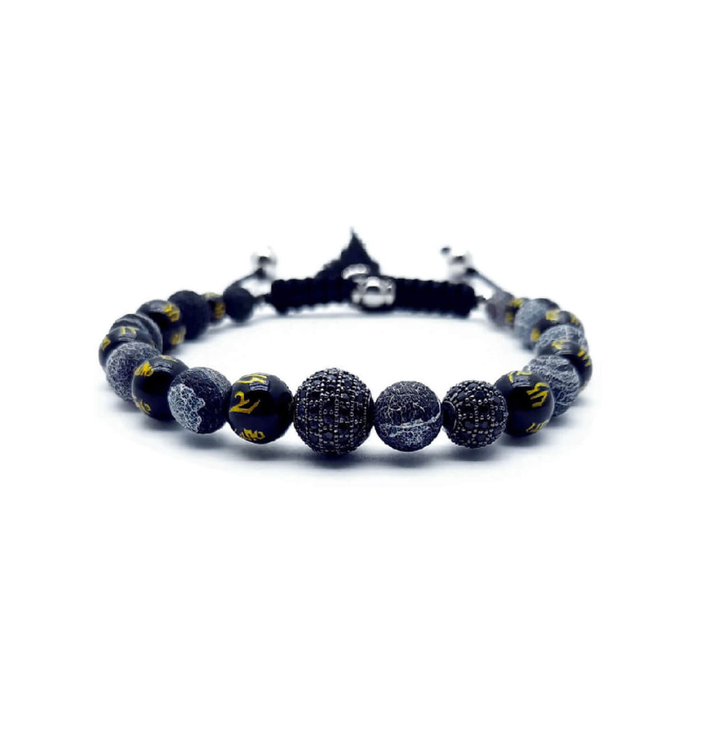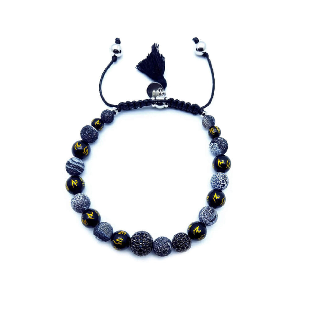 I cristalli neri utilizzati in questo bracciale trasmettono forza e potere a chi lo indossa. Tara nera è considerata l'invincibile, dai toni scuri e dall'aspetto moderatamente irato. La divinità regge il vaso nero da cui si liberano le armi che danno il potere di distruggere i sortilegi e le influenze negative. Il nero esotericamente e socialmente indica la volontà di andare contro la massa e di seguire la propria volontà, senza attenersi alle linee guida dettate dalla società.