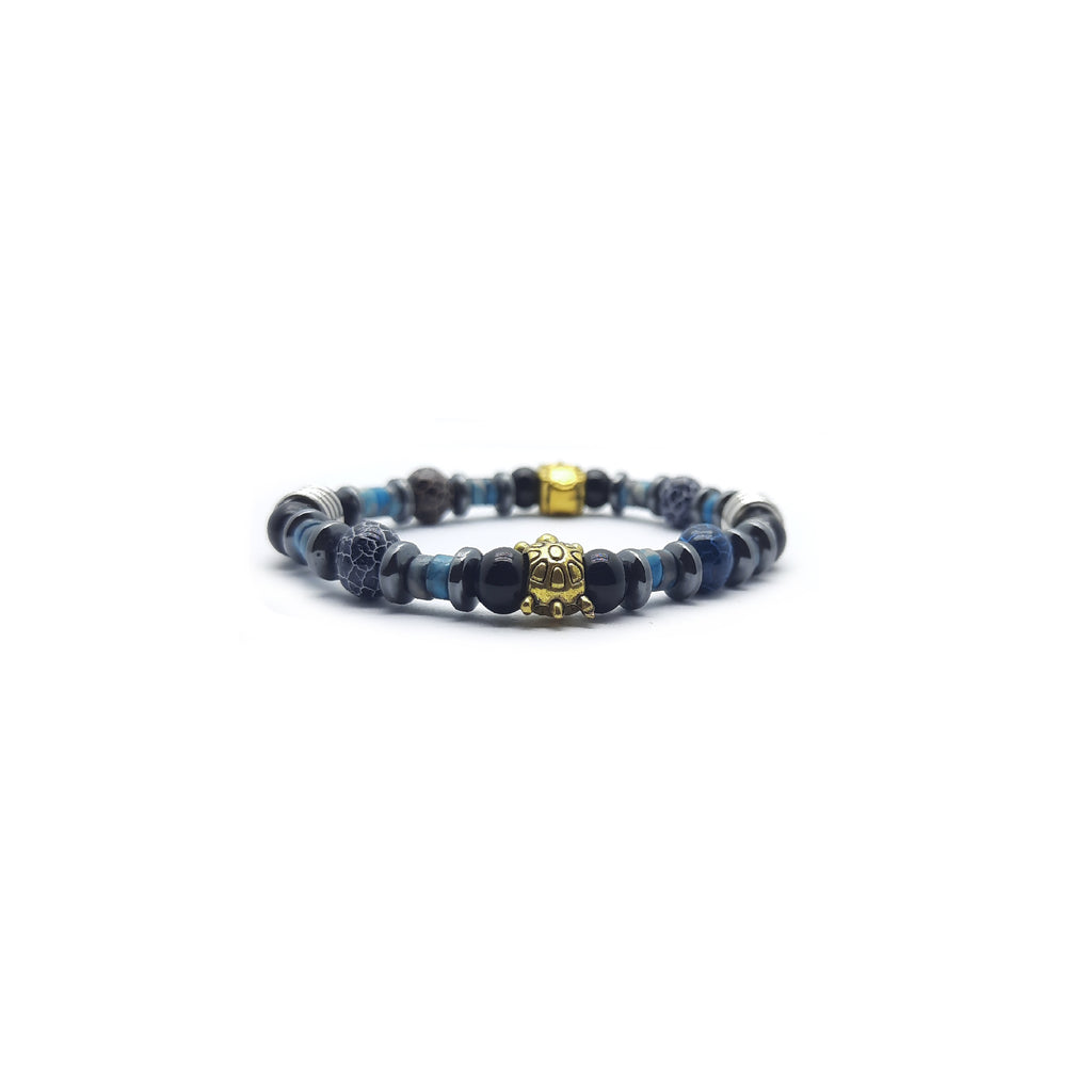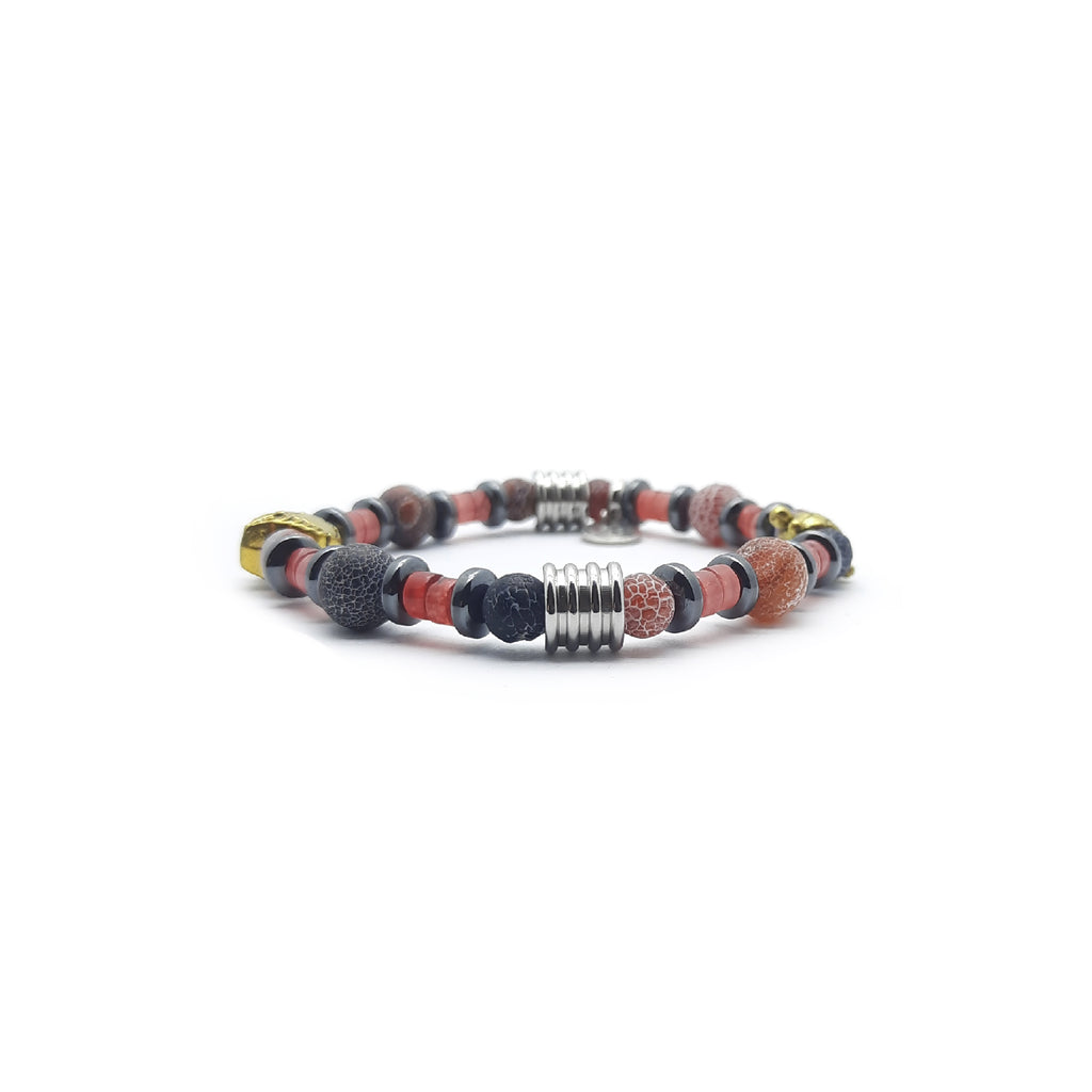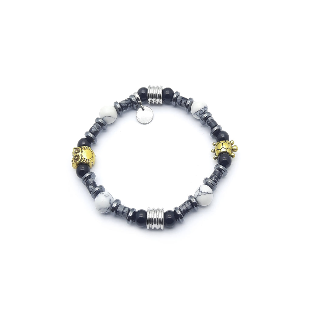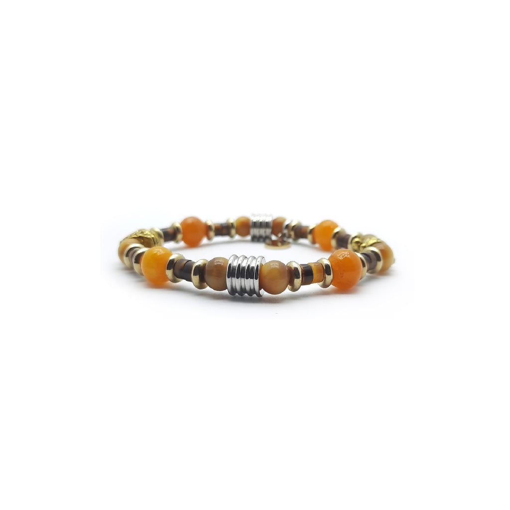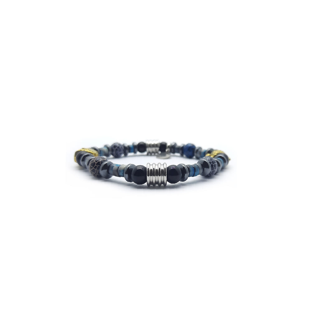 Un equilibrio perfetto tra forza ed eleganza. Il bracciale è un accessorio unisex dal design raffinato, realizzato con pietre naturali di diverse dimensioni e tonalità. Le quattro pietre centrali da 8 mm, protagoniste del design, si alternano armoniosamente con elementi da 6 mm, creando un gioco di contrasti dinamico e sofisticato. La struttura elastica assicura una vestibilità confortevole e adattabile, mentre i dettagli in acciaio 316L garantiscono resistenza, durata e un tocco di modernità. Un accessorio versatile, perfetto per chi desidera esprimere la propria personalità con stile ed equilibrio.