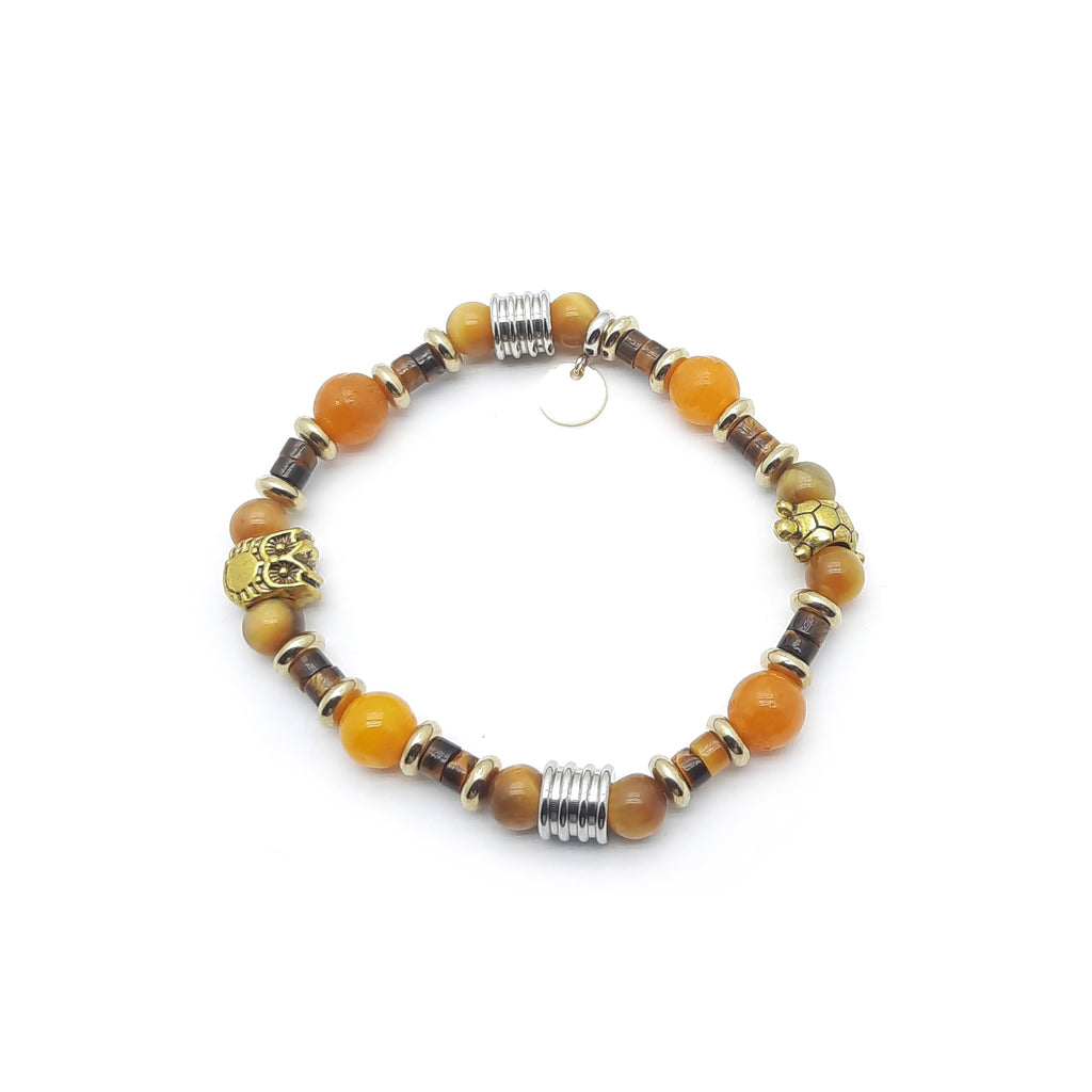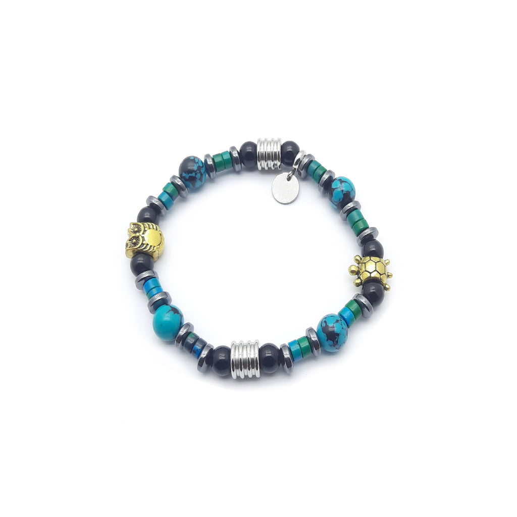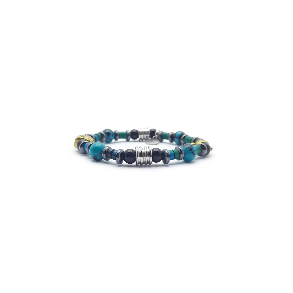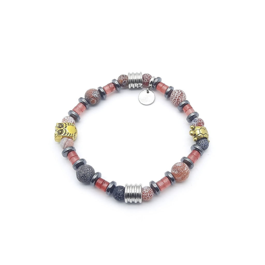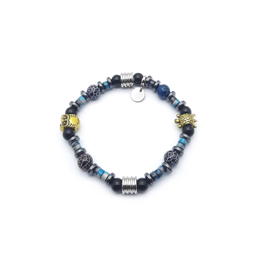 Un equilibrio perfetto tra forza ed eleganza. Il bracciale è un accessorio unisex dal design raffinato, realizzato con pietre naturali di diverse dimensioni e tonalità. Le quattro pietre centrali da 8 mm, protagoniste del design, si alternano armoniosamente con elementi da 6 mm, creando un gioco di contrasti dinamico e sofisticato. La struttura elastica assicura una vestibilità confortevole e adattabile, mentre i dettagli in acciaio 316L garantiscono resistenza, durata e un tocco di modernità. Un accessorio versatile, perfetto per chi desidera esprimere la propria personalità con stile ed equilibrio.