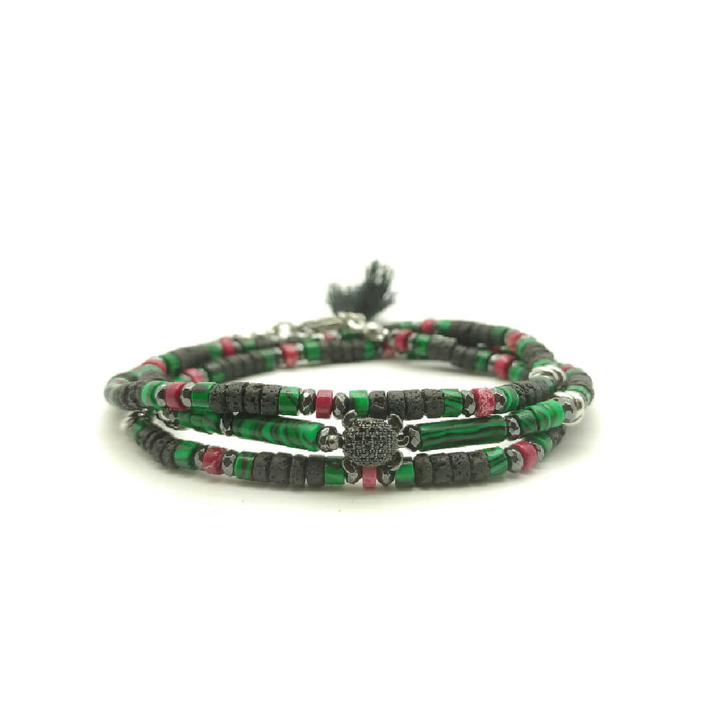 I cristalli neri utilizzati in questo bracciale trasmettono forza e potere a chi lo indossa. Tara nera è considerata l’invincibile, dai toni scuri e dall’aspetto moderatamente irato. La divinità regge il vaso nero da cui si liberano le armi che danno il potere di distruggere i sortilegi e le influenze negative. Il nero esotericamente e socialmente indica la volontà di andare contro la massa e di seguire la propria volontà, senza attenersi alle linee guida dettate dalla società.